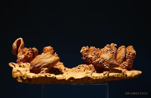 而对于东阳木雕,郭颢有着自己的一套理解,他认为传统文化中的木雕技艺和书画艺术源出一脉,蕴形重意,虽然创作过程不同,但最终都以“形”通“神”,赋予作品性灵,于是,他尝试将传统国画中的笔法运用到东阳木雕的创作中,并在日夜反复的练习中开创了自己独特的技艺“皴刀法”,所创作的作品形象干练线条流畅,造型更是大胆激进,突破传统工艺创作的桎梏,展现出了旺盛的艺术生命力。